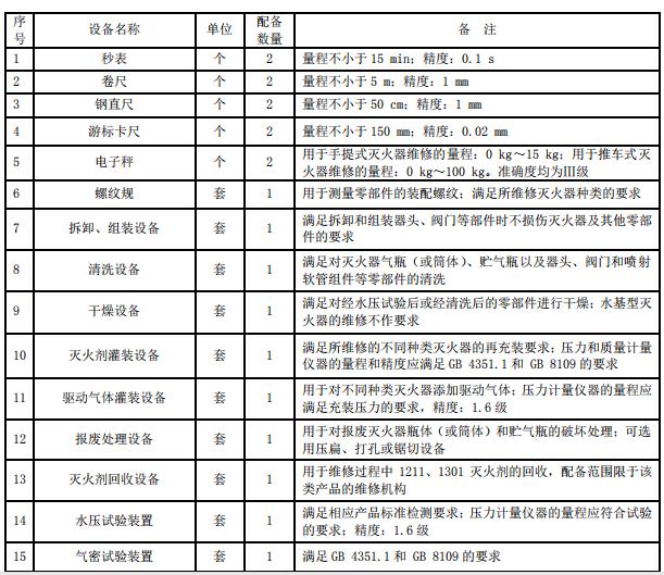 三級消防設施維護保養檢測設備用于滅火器的檢查、維修、更換滅火劑及回收,其設備配備的種類和數量至少應滿足表 3 的要求。