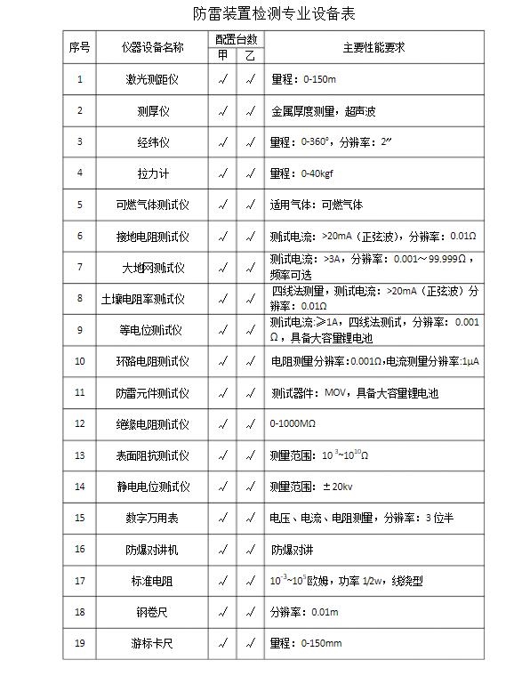 防雷檢測設備量具(皮尺、鋼直尺、鋼卷尺、卡鉗、千分尺、螺旋測微儀、游標卡尺、激光測距儀、測高儀、經緯儀)。工頻接地電阻測試儀、沖擊接地阻抗測試儀、土壤電阻率測試儀、鉗形接地電阻測試儀(單鉗型回路電阻測試儀)、地網型接地電阻測試儀、多功能接地電阻測試儀。絕緣電阻測試儀(兆歐表)、環路電阻測試儀(N-PE環路電阻測試儀)、絕緣/導通測試儀、數字微歐表、毫歐表、過渡電阻測試儀、等電位測試儀。數字萬用表、鉗形電流表、漏電電流測試儀、電力諧波鉗形表、諧波分析儀、漏電開關測試儀、電力質量綜合檢測儀、低壓電器綜合測試儀、頻譜分析儀。